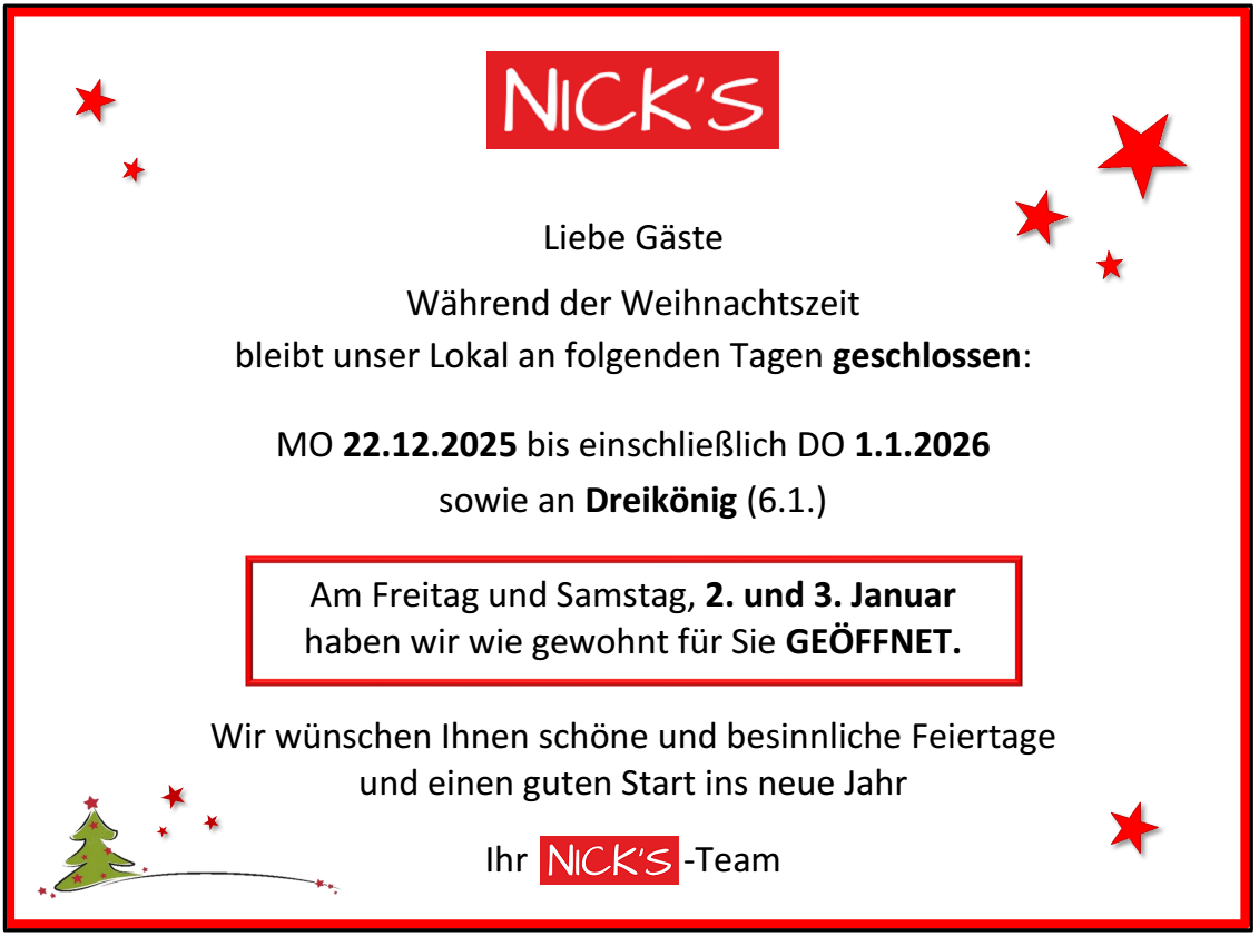 ...in direkter Nachbarschaft, 3 Gehminuten entfernt, finden Sie unser Nick's.